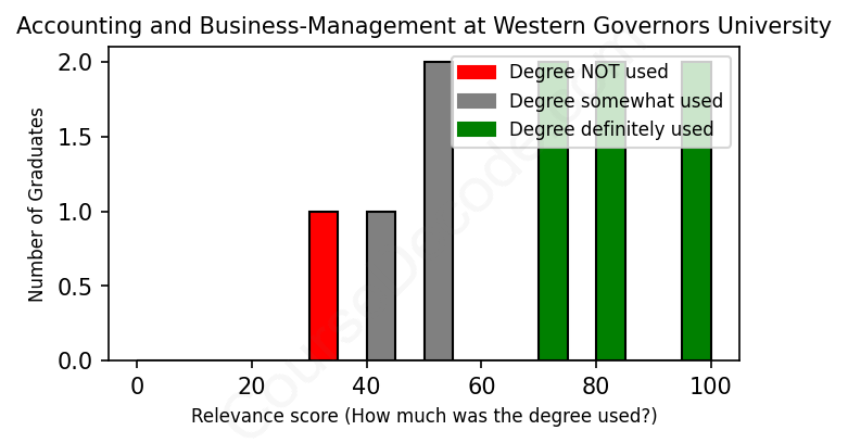 The verdict? Slightly above average. Overall, with an average relevance score of 68%, Accounting and Business-Management graduates from Western Governors University have a slightly higher likelihood (+1%) of finding work in this field compared to the average graduate across all fields: