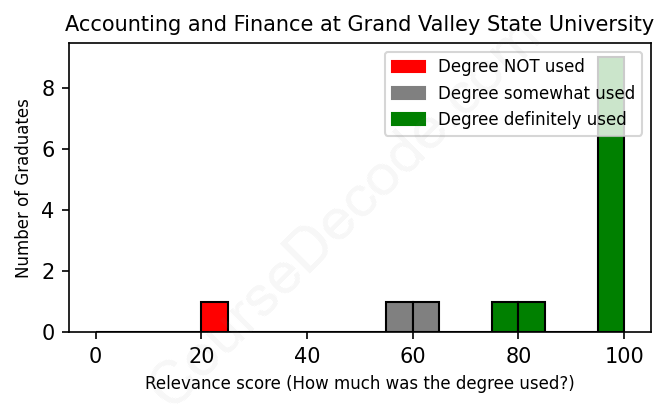 The verdict? Significantly above average. Overall, with an average relevance score of 85%, Accounting and Finance graduates from Grand Valley State University have a much higher likelihood (+18%) of finding work in this field compared to the average graduate across all fields: