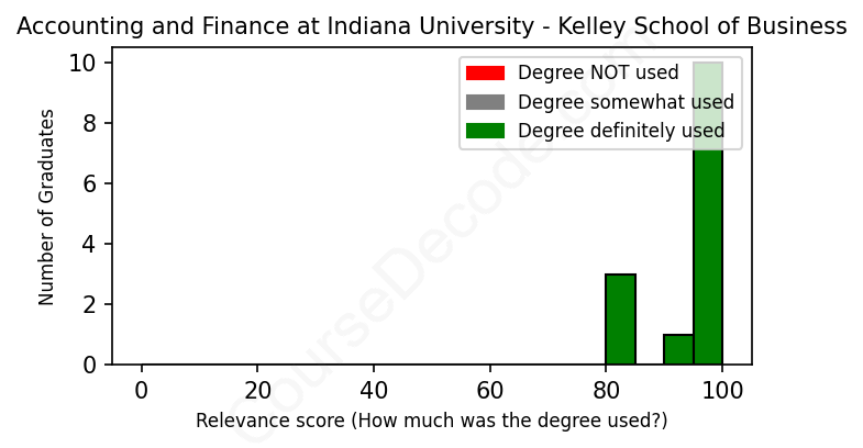 First, some facts. Of the Accounting and Finance graduates from Indiana University - Kelley School of Business we've analyzed , here's how many have used (or NOT used) their degree in their career: