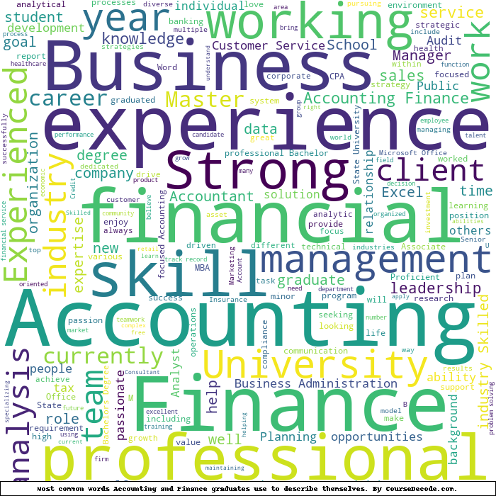 Here is a visual representation of the most common words seen in the "about" section of LinkedIn profiles who have a Bachelor degree in Accounting and Finance (this is across all Accounting and Finance graduates we've analyzed, not just those who went to University of Phoenix). This may or may not be useful: