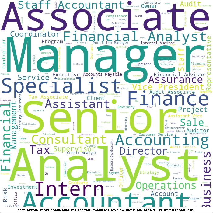 Here is a visual representation of the most common words in job titles for Accounting and Finance graduates (this is across all Accounting and Finance graduates we've analyzed, not just those who went to University of Phoenix):