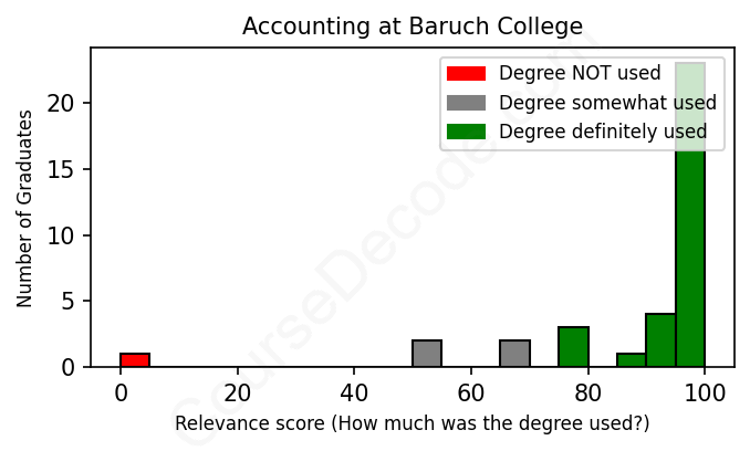 The verdict? Great! Overall, with an average relevance score of 89%, Accounting graduates from Baruch College have a substantially higher likelihood (+22%) of finding work in this field compared to the average graduate across all fields: