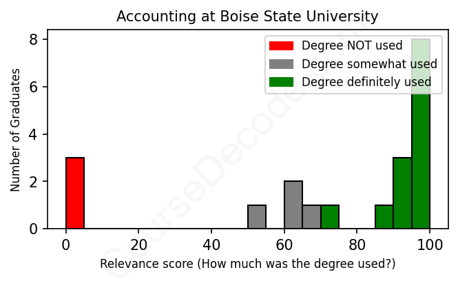 The verdict? Above average. Overall, with an average relevance score of 73%, Accounting graduates from Boise State University have a higher likelihood (+6%) of finding work in this field compared to the average graduate across all fields: