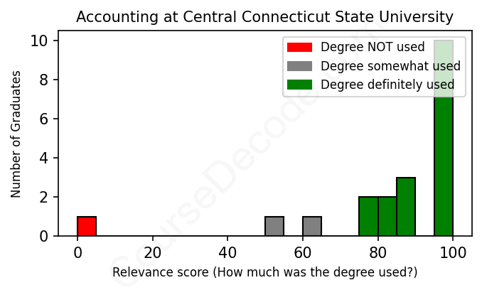 The verdict? Significantly above average. Overall, with an average relevance score of 84%, Accounting graduates from Central Connecticut State University have a much higher likelihood (+17%) of finding work in this field compared to the average graduate across all fields: