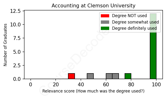 The verdict? Significantly above average. Overall, with an average relevance score of 87%, Accounting graduates from Clemson University have a much higher likelihood (+20%) of finding work in this field compared to the average graduate across all fields: