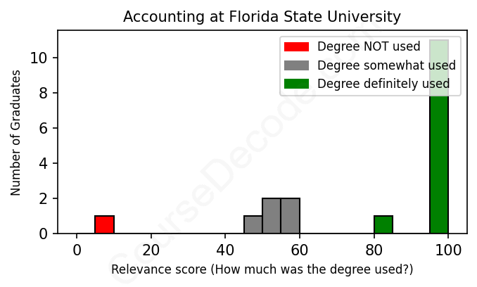 The verdict? Significantly above average. Overall, with an average relevance score of 80%, Accounting graduates from Florida State University have a much higher likelihood (+13%) of finding work in this field compared to the average graduate across all fields: