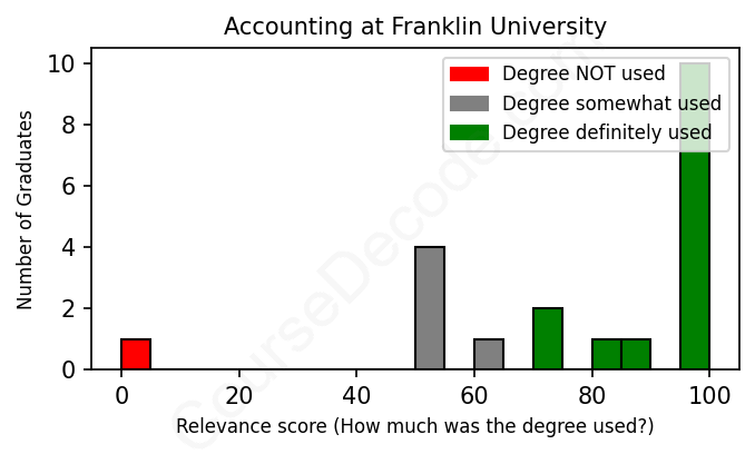 The verdict? Significantly above average. Overall, with an average relevance score of 78%, Accounting graduates from Franklin University have a much higher likelihood (+11%) of finding work in this field compared to the average graduate across all fields: