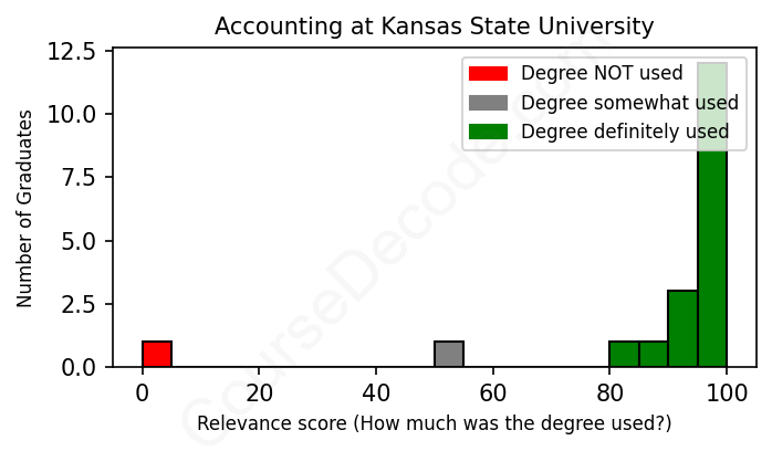 The verdict? Great! Overall, with an average relevance score of 89%, Accounting graduates from Kansas State University have a substantially higher likelihood (+22%) of finding work in this field compared to the average graduate across all fields: