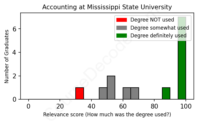 The verdict? Significantly above average. Overall, with an average relevance score of 78%, Accounting graduates from Mississippi State University have a much higher likelihood (+11%) of finding work in this field compared to the average graduate across all fields: