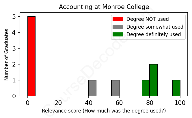 The verdict? Bad. Overall, with an average relevance score of 40%, Accounting graduates from Monroe College have a substantially lower likelihood (-27%) of finding work in this field compared to the average graduate across all fields: