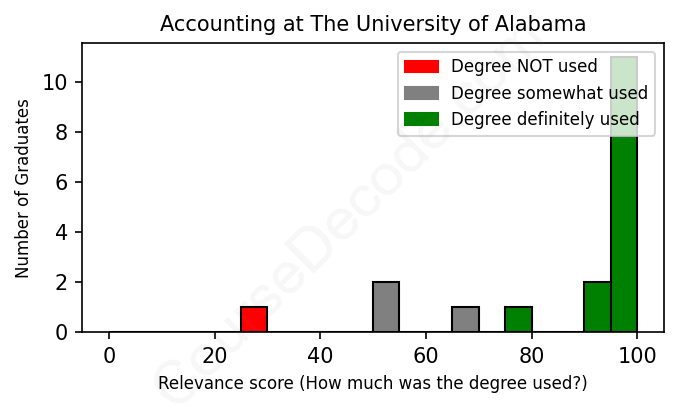 The verdict? Significantly above average. Overall, with an average relevance score of 85%, Accounting graduates from The University of Alabama have a much higher likelihood (+18%) of finding work in this field compared to the average graduate across all fields: