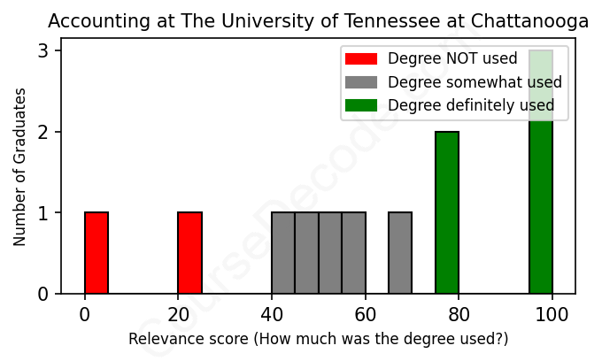The verdict? Below average. Overall, with an average relevance score of 61%, Accounting graduates from The University of Tennessee at Chattanooga have a lower likelihood (-6%) of finding work in this field compared to the average graduate across all fields: