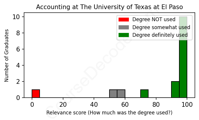 The verdict? Significantly above average. Overall, with an average relevance score of 85%, Accounting graduates from The University of Texas at El Paso have a much higher likelihood (+18%) of finding work in this field compared to the average graduate across all fields: