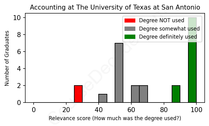 The verdict? Slightly above average. Overall, with an average relevance score of 72%, Accounting graduates from The University of Texas at San Antonio have a slightly higher likelihood (+5%) of finding work in this field compared to the average graduate across all fields: