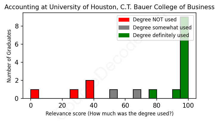 The verdict? Above average. Overall, with an average relevance score of 75%, Accounting graduates from University of Houston, C.T. Bauer College of Business have a higher likelihood (+8%) of finding work in this field compared to the average graduate across all fields: