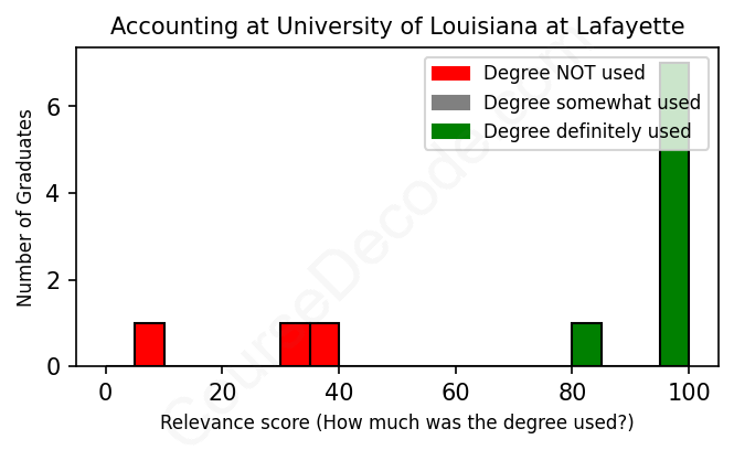 First, some facts. Of the Accounting graduates from University of Louisiana at Lafayette we've analyzed , here's how many have used (or NOT used) their degree in their career: