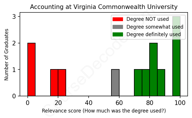 First, some facts. Of the Accounting graduates from Virginia Commonwealth University we've analyzed , here's how many have used (or NOT used) their degree in their career: