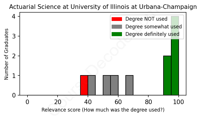 The verdict? Above average. Overall, with an average relevance score of 76%, Actuarial Science graduates from University of Illinois at Urbana-Champaign have a higher likelihood (+9%) of finding work in this field compared to the average graduate across all fields: