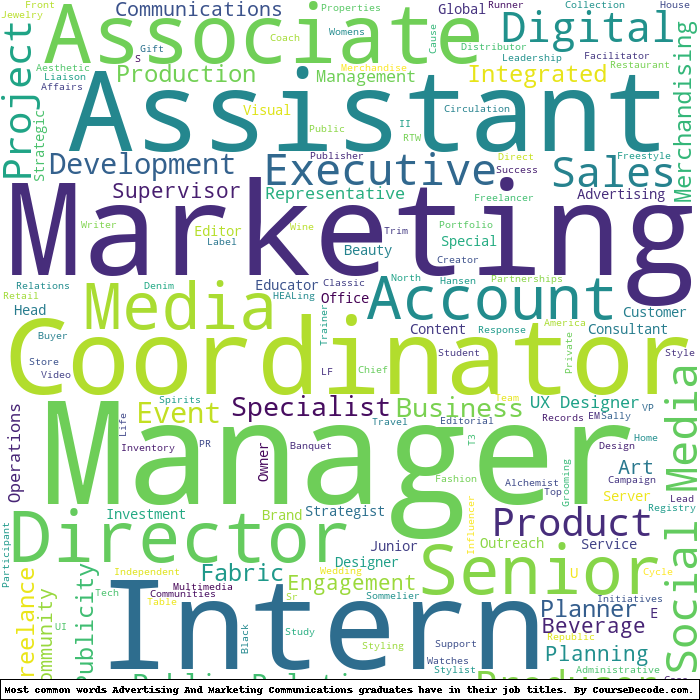 Here is a visual representation of the most common words in job titles for Advertising And Marketing Communications graduates (this is across all Advertising And Marketing Communications graduates we've analyzed, not just those who went to Fashion Institute of Technology):