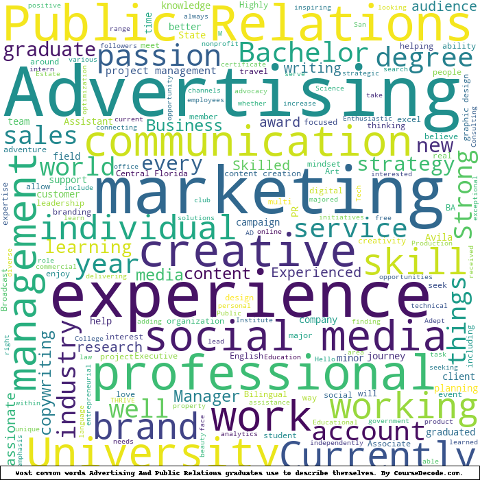 Here is a visual representation of the most common words seen in the "about" section of LinkedIn profiles who have a Bachelor degree in Advertising And Public Relations. This may or may not be useful: