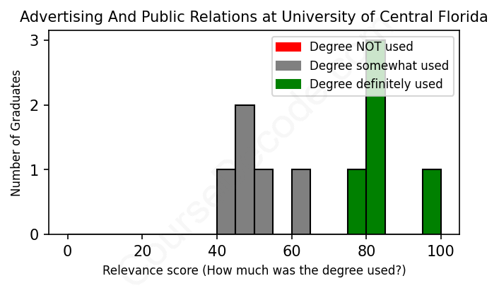 The verdict? Slightly below average. Overall, with an average relevance score of 66%, Advertising And Public Relations graduates from University of Central Florida have a slightly lower likelihood (-1%) of finding work in this field compared to the average graduate across all fields: