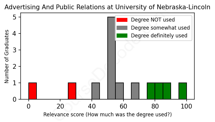 The verdict? Significantly below average. Overall, with an average relevance score of 56%, Advertising And Public Relations graduates from University of Nebraska-Lincoln have a much lower likelihood (-11%) of finding work in this field compared to the average graduate across all fields: