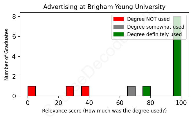 The verdict? Above average. Overall, with an average relevance score of 77%, Advertising graduates from Brigham Young University have a higher likelihood (+10%) of finding work in this field compared to the average graduate across all fields: