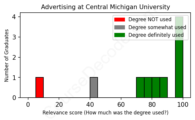The verdict? Above average. Overall, with an average relevance score of 75%, Advertising graduates from Central Michigan University have a higher likelihood (+8%) of finding work in this field compared to the average graduate across all fields: