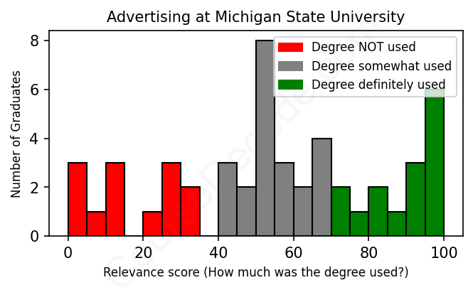 The verdict? Significantly below average. Overall, with an average relevance score of 54%, Advertising graduates from Michigan State University have a much lower likelihood (-13%) of finding work in this field compared to the average graduate across all fields: