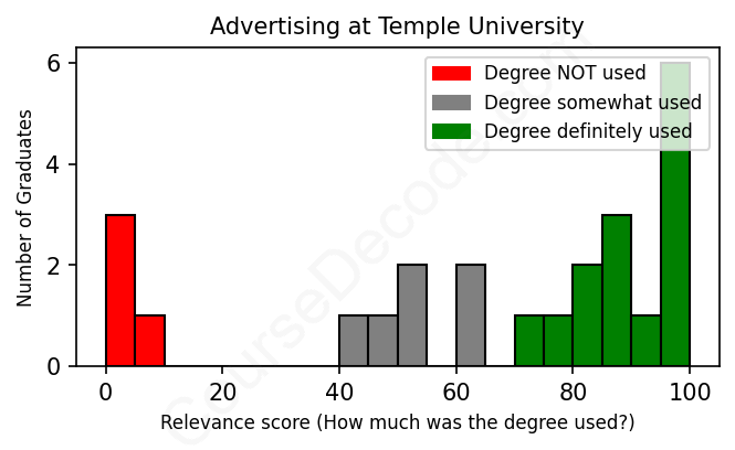 The verdict? Slightly below average. Overall, with an average relevance score of 66%, Advertising graduates from Temple University have a slightly lower likelihood (-1%) of finding work in this field compared to the average graduate across all fields: