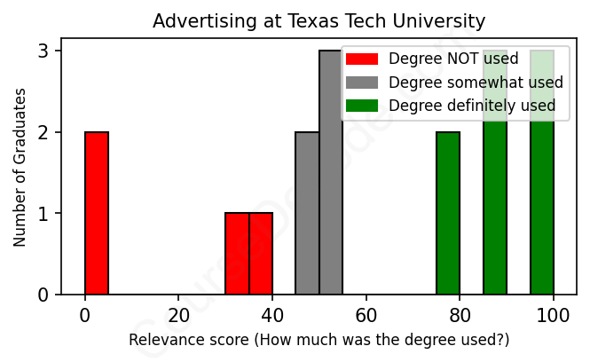 The verdict? Below average. Overall, with an average relevance score of 60%, Advertising graduates from Texas Tech University have a lower likelihood (-7%) of finding work in this field compared to the average graduate across all fields: