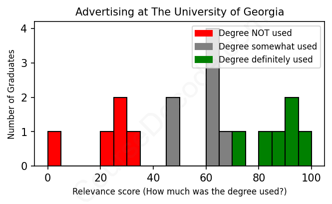 The verdict? Below average. Overall, with an average relevance score of 57%, Advertising graduates from The University of Georgia have a lower likelihood (-10%) of finding work in this field compared to the average graduate across all fields: