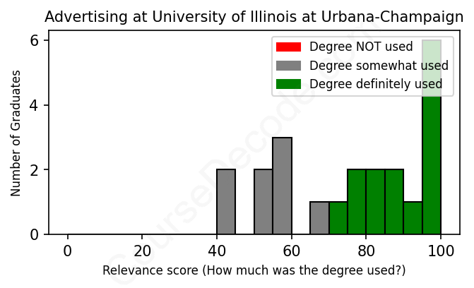 The verdict? Above average. Overall, with an average relevance score of 76%, Advertising graduates from University of Illinois at Urbana-Champaign have a higher likelihood (+9%) of finding work in this field compared to the average graduate across all fields: