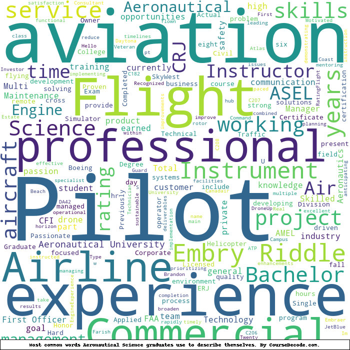 Here is a visual representation of the most common words seen in the "about" section of LinkedIn profiles who have a Bachelor degree in Aeronautical Science (this is across all Aeronautical Science graduates we've analyzed, not just those who went to Embry-Riddle Aeronautical University). This may or may not be useful: