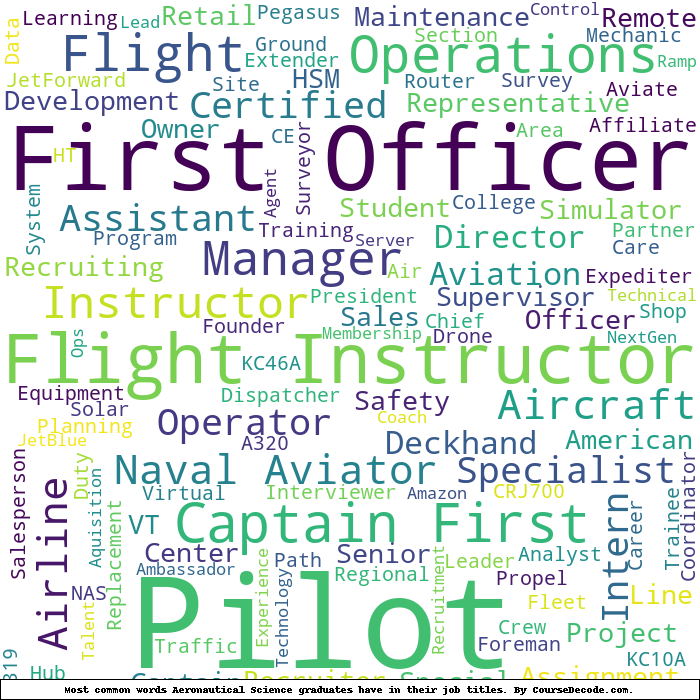 Here is a visual representation of the most common words in job titles for Aeronautical Science graduates (this is across all Aeronautical Science graduates we've analyzed, not just those who went to Embry-Riddle Aeronautical University):