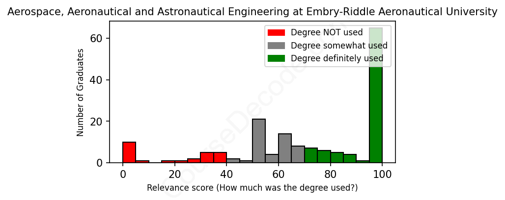 The verdict? Slightly above average. Overall, with an average relevance score of 71%, Aerospace, Aeronautical and Astronautical Engineering graduates from Embry-Riddle Aeronautical University have a slightly higher likelihood (+4%) of finding work in this field compared to the average graduate across all fields: