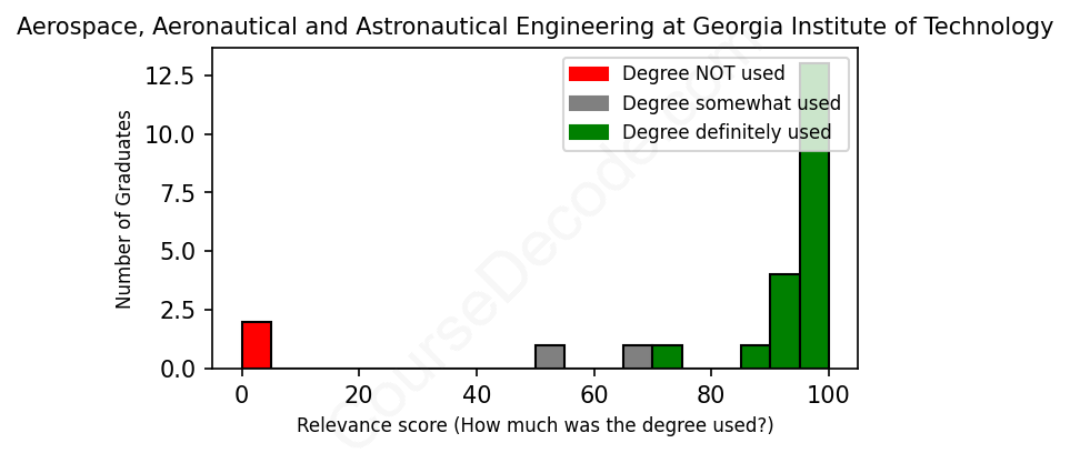 The verdict? Significantly above average. Overall, with an average relevance score of 84%, Aerospace, Aeronautical and Astronautical Engineering graduates from Georgia Institute of Technology have a much higher likelihood (+17%) of finding work in this field compared to the average graduate across all fields: