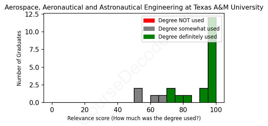The verdict? Significantly above average. Overall, with an average relevance score of 87%, Aerospace, Aeronautical and Astronautical Engineering graduates from Texas A&M University have a much higher likelihood (+20%) of finding work in this field compared to the average graduate across all fields: