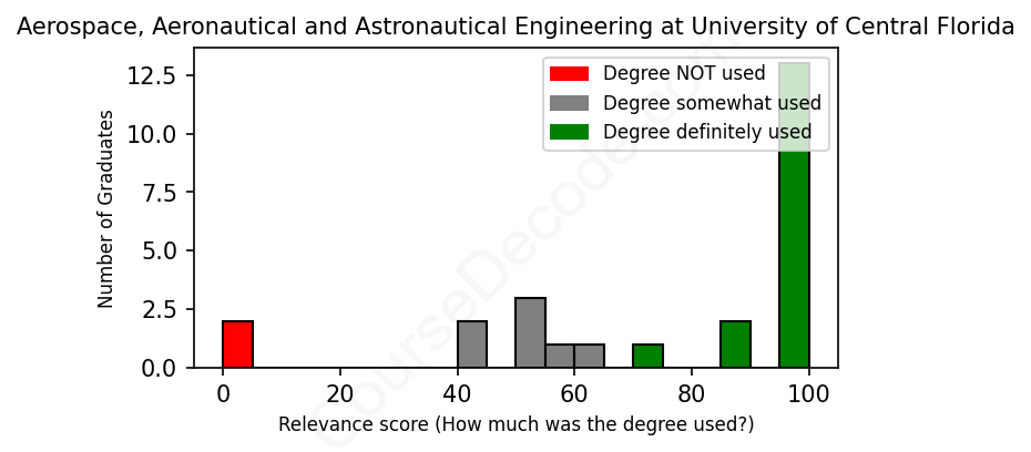 The verdict? Above average. Overall, with an average relevance score of 75%, Aerospace, Aeronautical and Astronautical Engineering graduates from University of Central Florida have a higher likelihood (+8%) of finding work in this field compared to the average graduate across all fields: