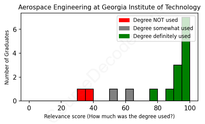 The verdict? Significantly above average. Overall, with an average relevance score of 82%, Aerospace Engineering graduates from Georgia Institute of Technology have a much higher likelihood (+15%) of finding work in this field compared to the average graduate across all fields: