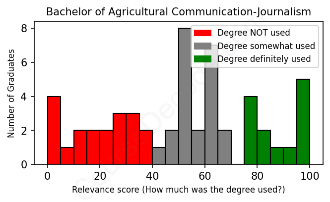 The verdict? Significantly below average. Overall, with an average relevance score of 50%, Agricultural Communication-Journalism graduates have a much lower likelihood (-17%) of finding work in this field compared to the average graduate across all fields: