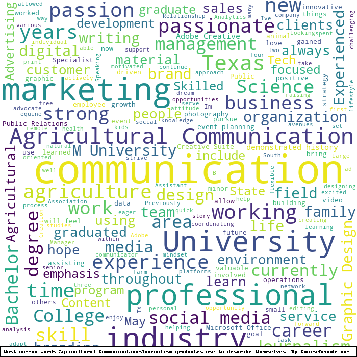 Here is a visual representation of the most common words seen in the "about" section of LinkedIn profiles who have a Bachelor degree in Agricultural Communication-Journalism. This may or may not be useful: