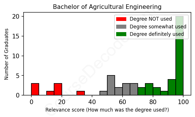 The verdict? Slightly above average. Overall, with an average relevance score of 71%, Agricultural Engineering graduates have a slightly higher likelihood (+4%) of finding work in this field compared to the average graduate across all fields: