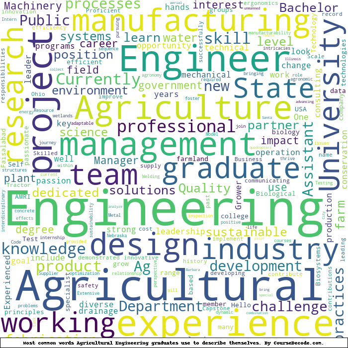 Here is a visual representation of the most common words seen in the "about" section of LinkedIn profiles who have a Bachelor degree in Agricultural Engineering. This may or may not be useful: