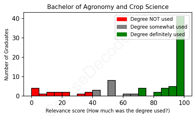 The verdict? Above average. Overall, with an average relevance score of 75%, Agronomy and Crop Science graduates have a higher likelihood (+8%) of finding work in this field compared to the average graduate across all fields: