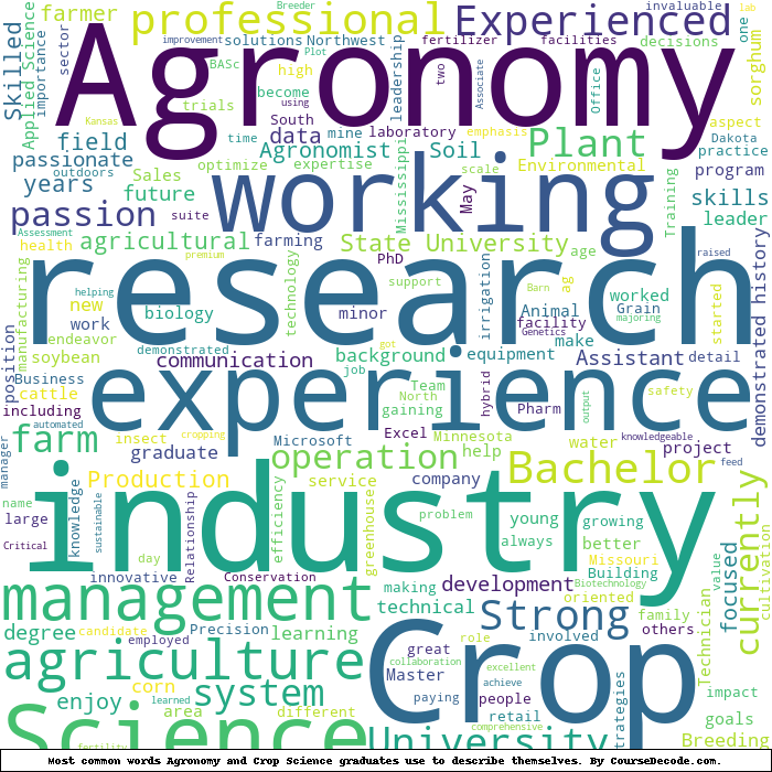 Here is a visual representation of the most common words seen in the "about" section of LinkedIn profiles who have a Bachelor degree in Agronomy and Crop Science. This may or may not be useful:
