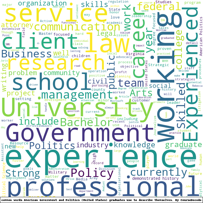 Here is a visual representation of the most common words seen in the "about" section of LinkedIn profiles who have a Bachelor degree in American Government and Politics (United States). This may or may not be useful: