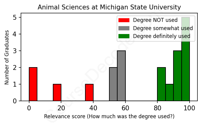 The verdict? On par with the average. Overall, with an average relevance score of 67%, Animal Sciences graduates from Michigan State University have about the same likelihood of finding work in this field as the average graduate across all fields: