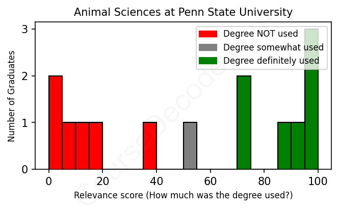 The verdict? Significantly below average. Overall, with an average relevance score of 53%, Animal Sciences graduates from Penn State University have a much lower likelihood (-14%) of finding work in this field compared to the average graduate across all fields: