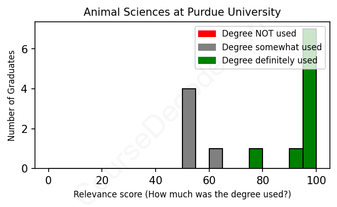 The verdict? Significantly above average. Overall, with an average relevance score of 80%, Animal Sciences graduates from Purdue University have a much higher likelihood (+13%) of finding work in this field compared to the average graduate across all fields: